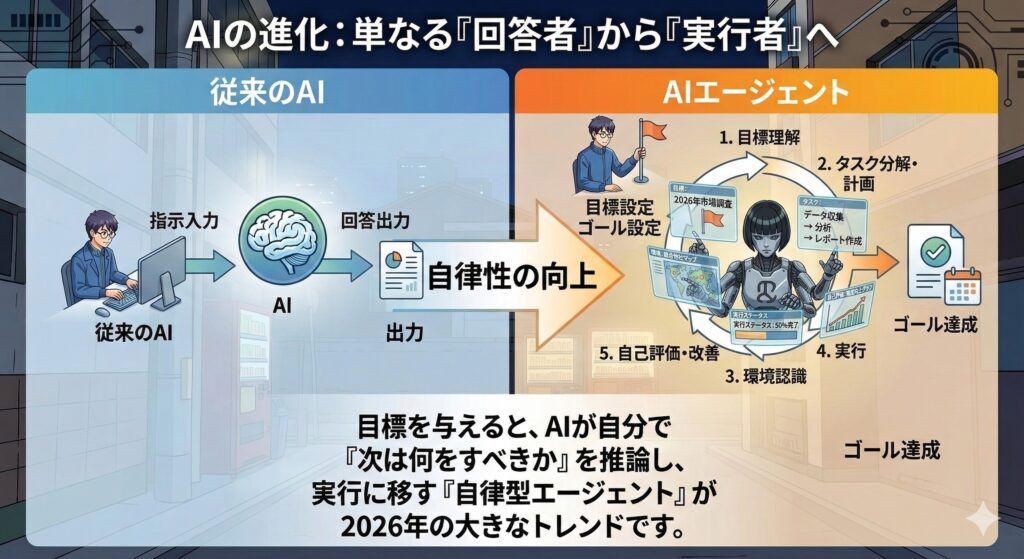 ・自律性の向上: 目標を与えると、AIが自分で「次は何をすべきか」を推論し、実行に移す「自律型エージェント」の拡大が2026年の大きなトレンドです。